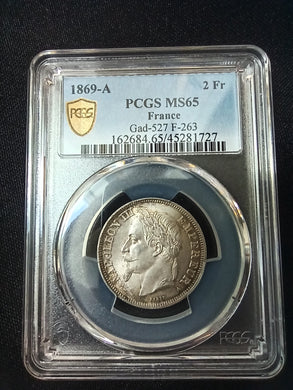 2 Francs Napoleon III Tête Laurée 1869 A ; PCGS : MS 65