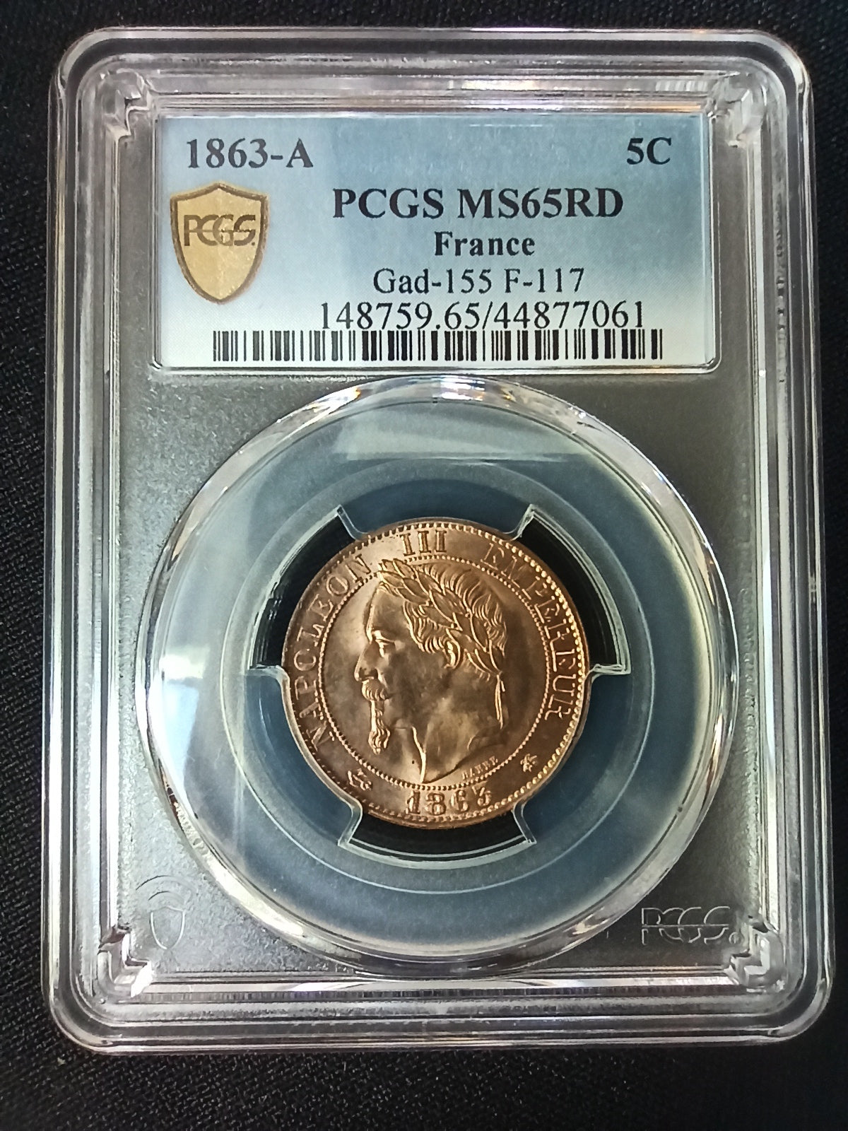 5 Centimes 1863 A Napoleon III ; PCGS : MS 65