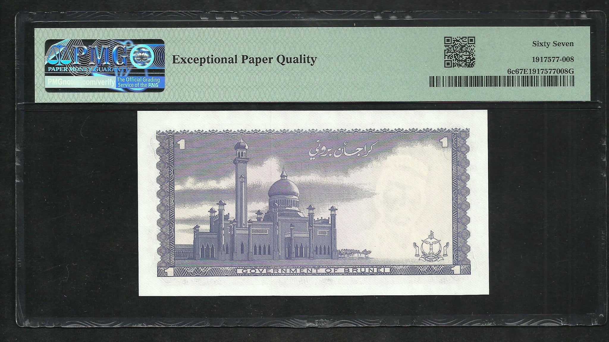 Brunei : One Dollar 1985 ; PMG : Superb Gem UNC 67 ; EPQ (Ref 1908)