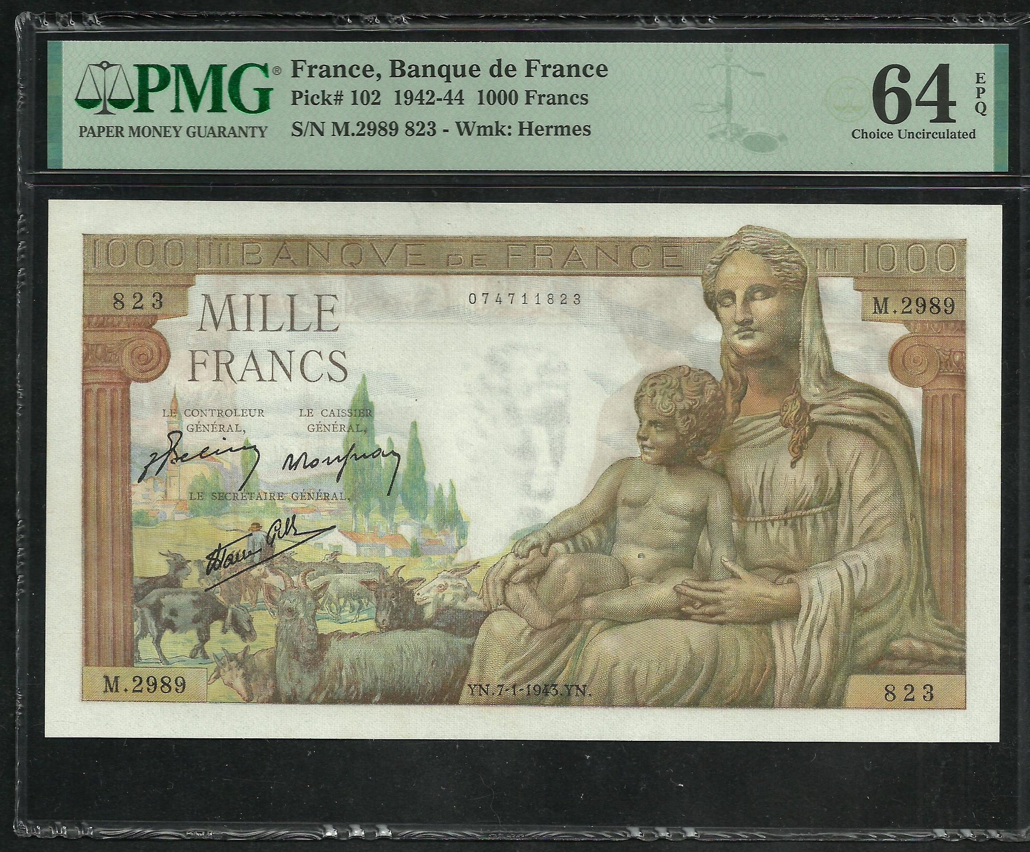 France : 1000 Francs Demeter 7-1-1943 ; PMG : Choice UNC 64 ; EPQ (Ref 1933)