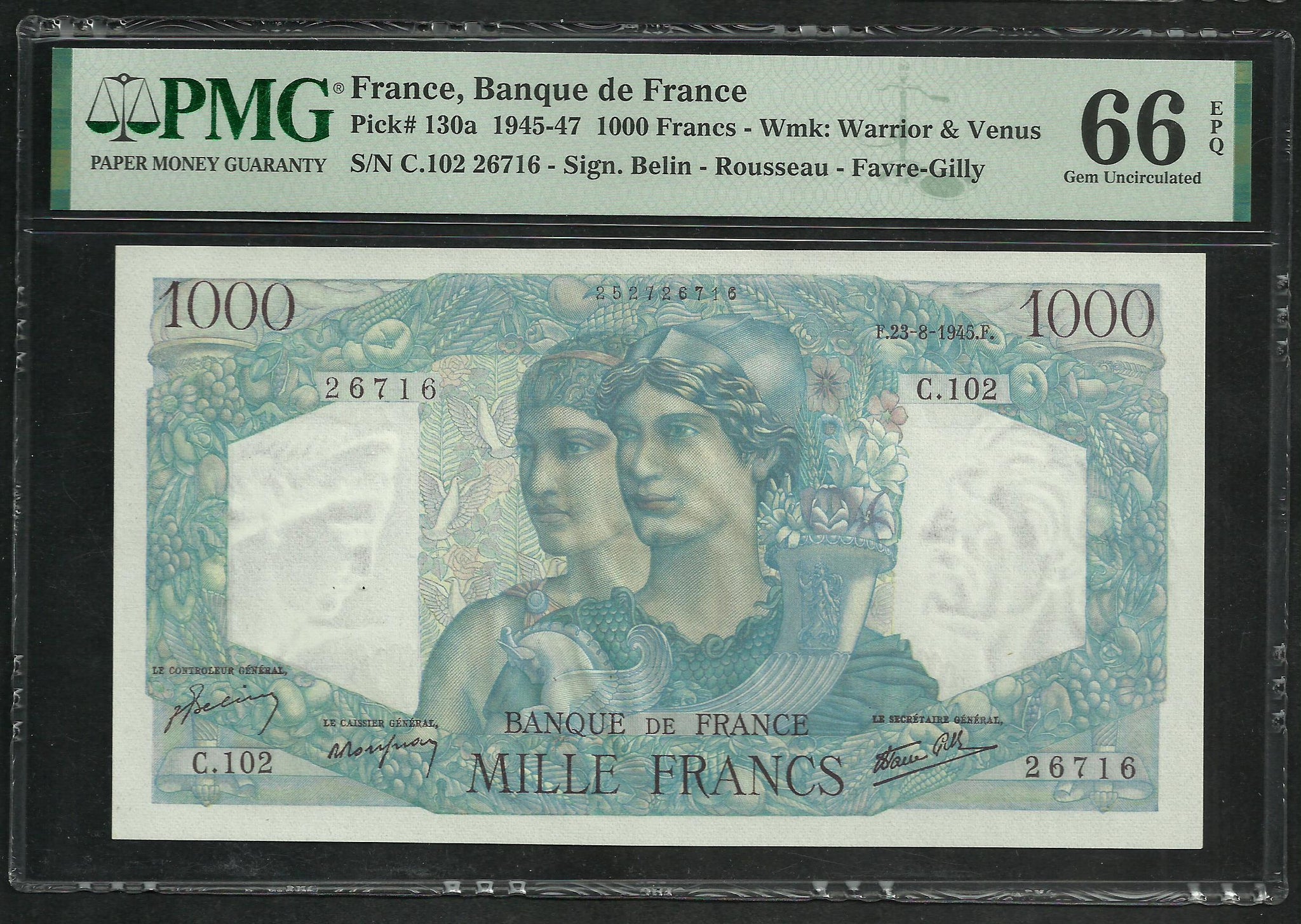 France : 1000 Francs Minerve 23-8-1945 ; PMG : Gem UNC 66 (Ref 1948)