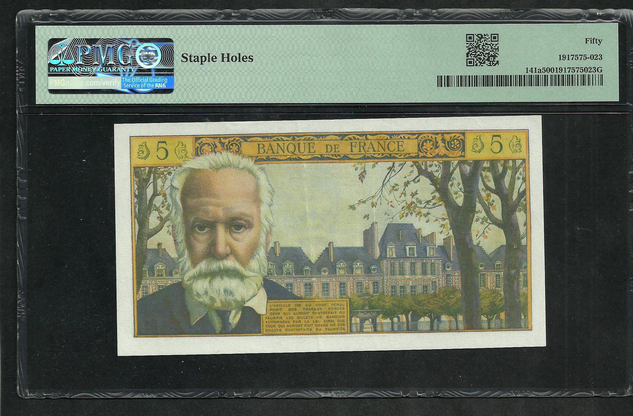 France : 5 NF Victor Hugo 6-5-1965 ; PMG : About UNC 50 (Ref 1952)