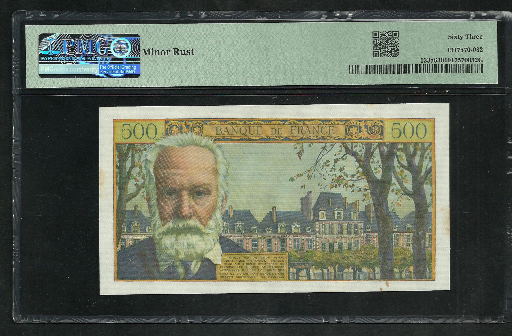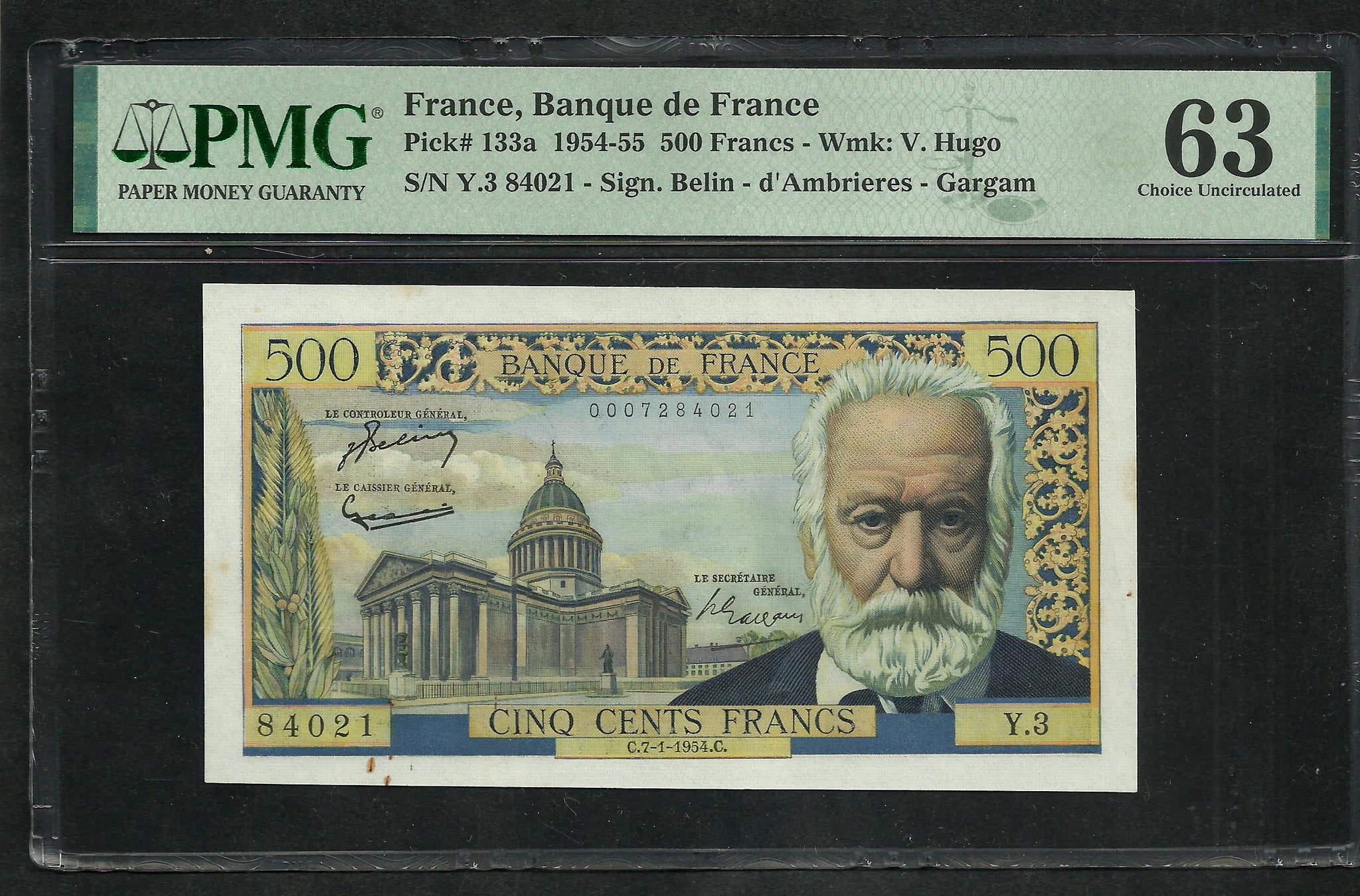 France : 500 Francs Victor Hugo 7-1-1954 ; PMG : Choice UNC 63 (Ref 1951)