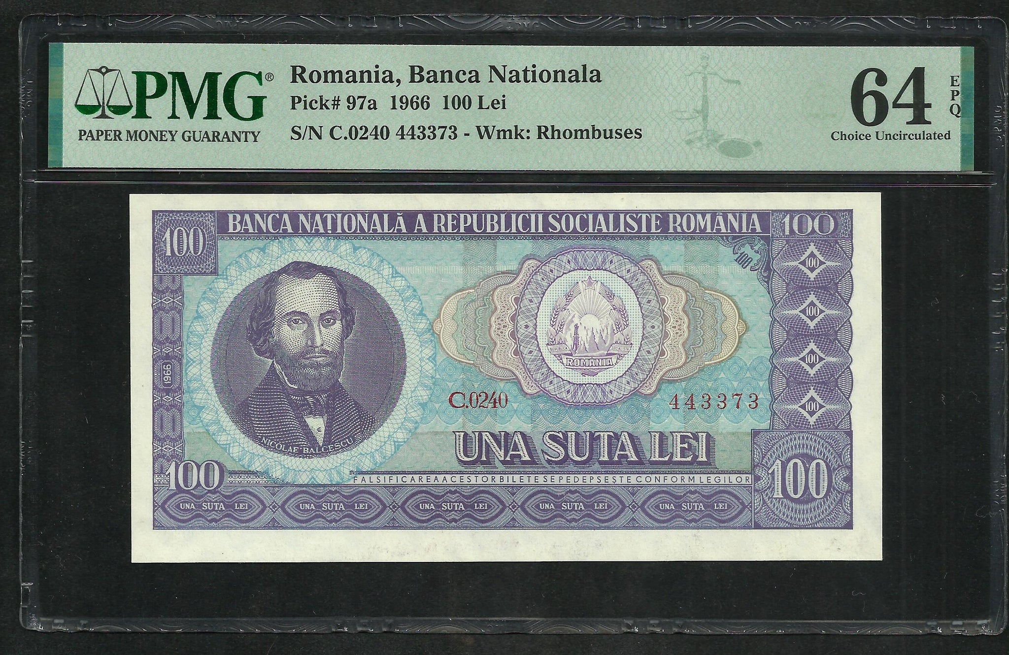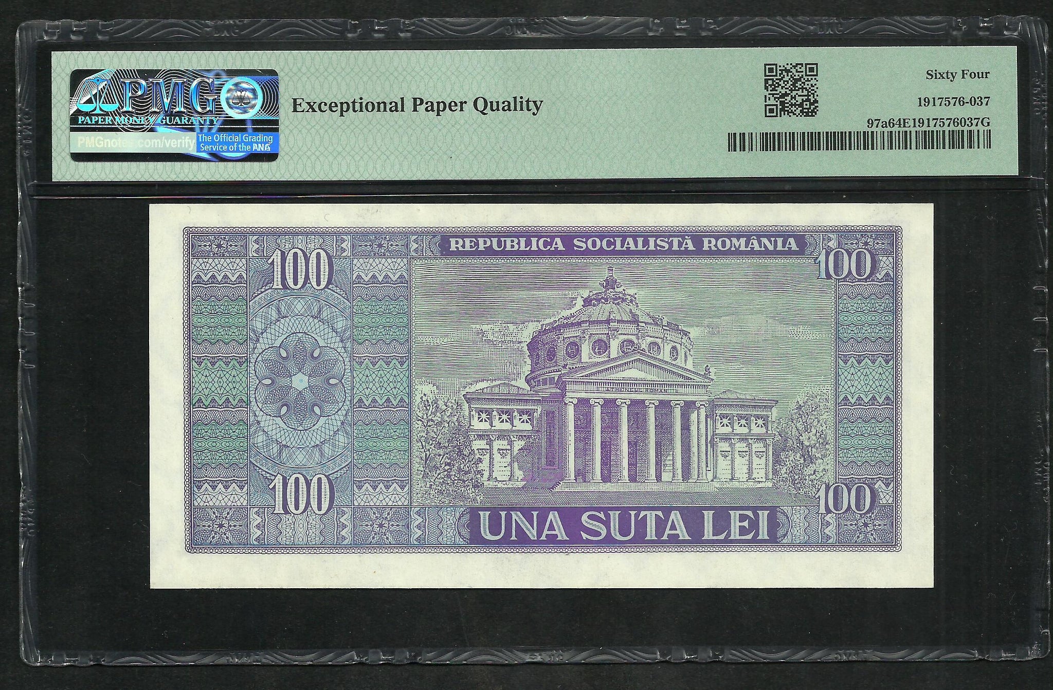 Romania : 100 Lei 1966 ; PMG : Choice UNC 64 ; EPQ (Ref 1872)