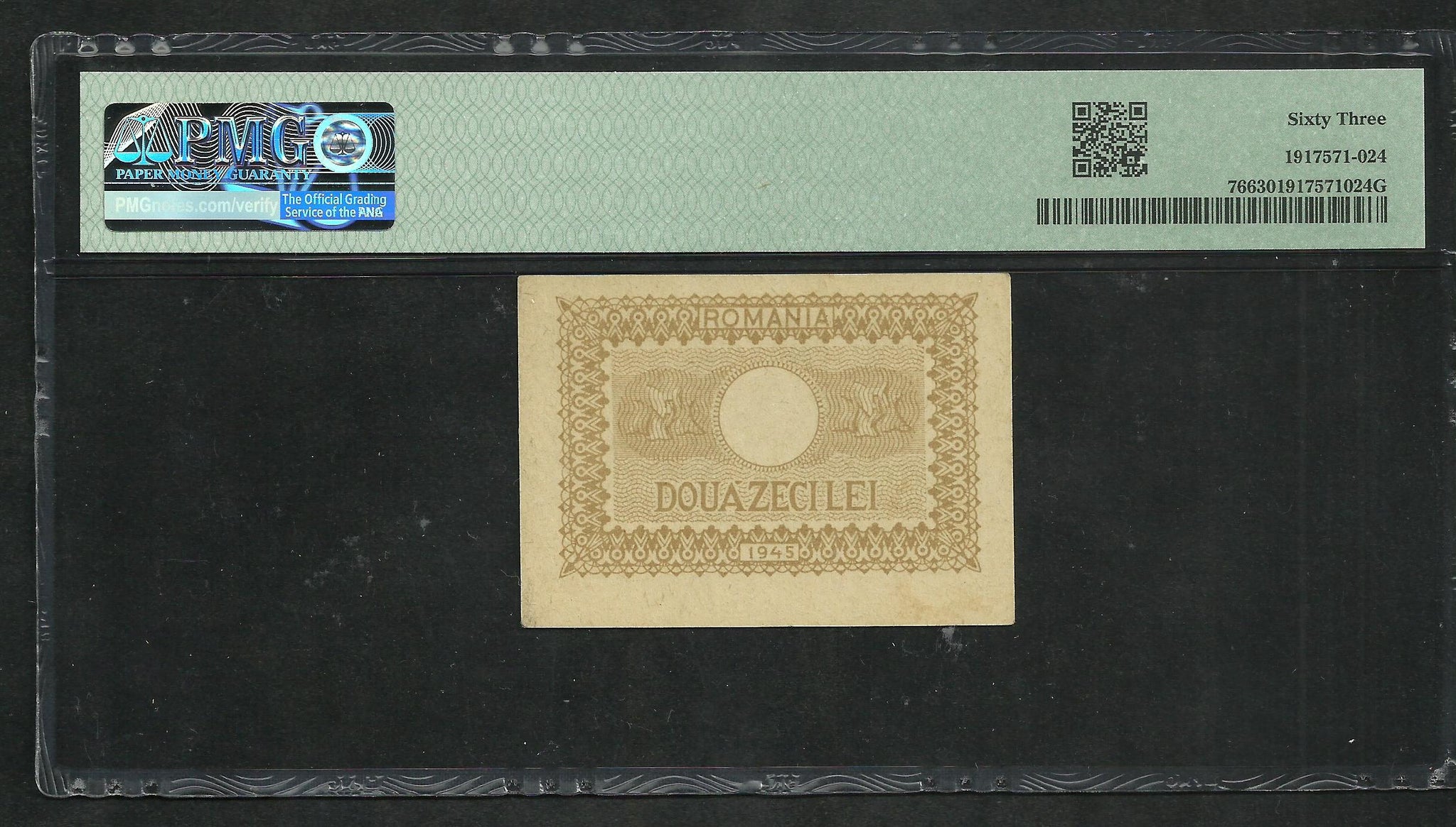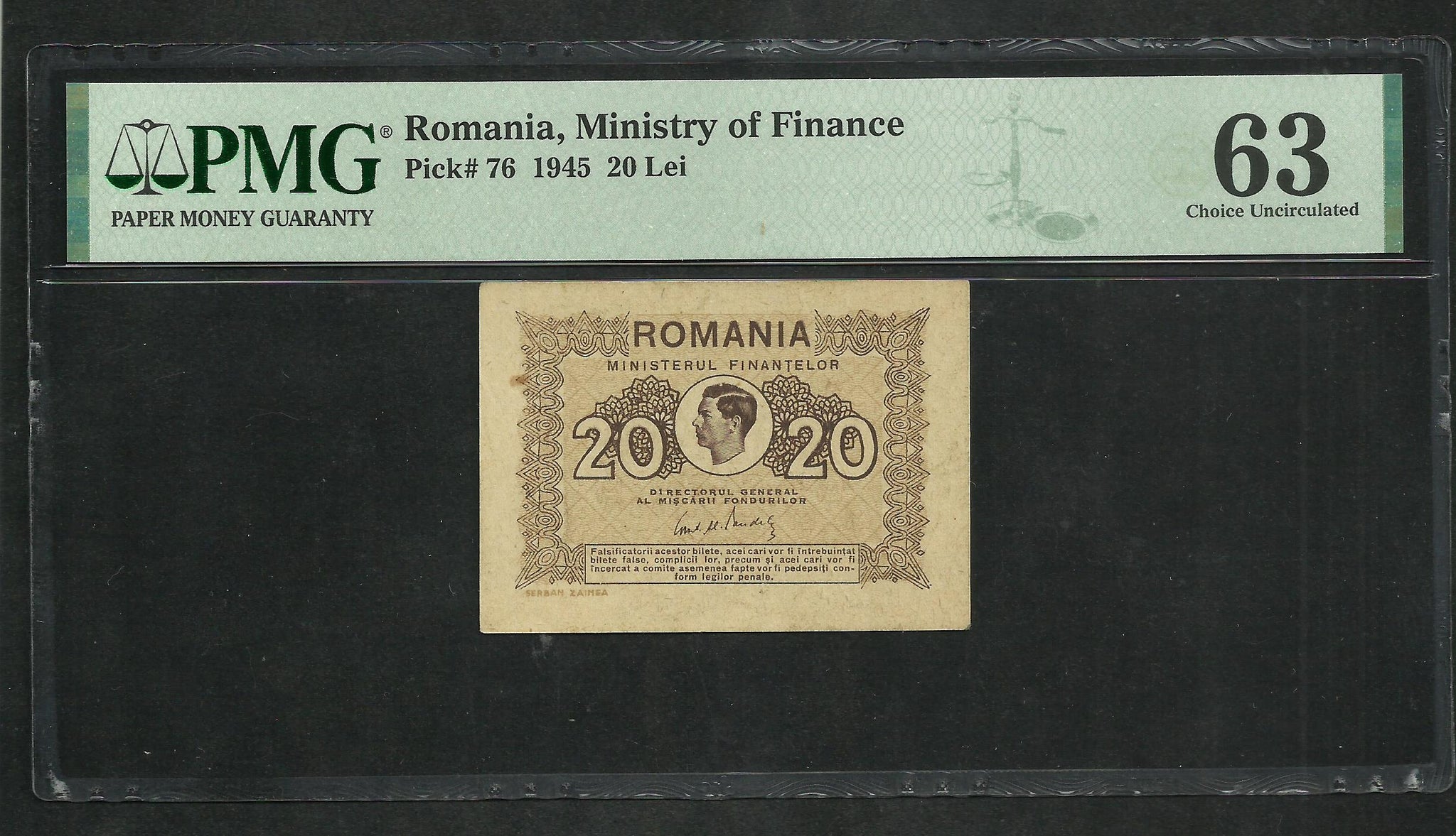 Romania : 20 Lei 1945 ; PMG : Choice UNC 63 ; EPQ (Ref 1873)