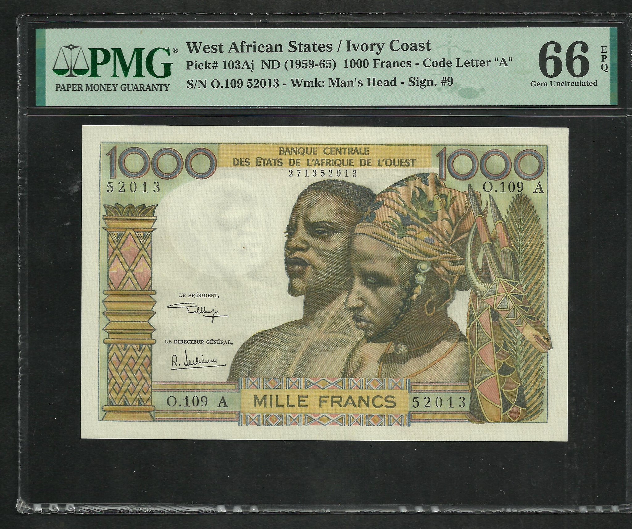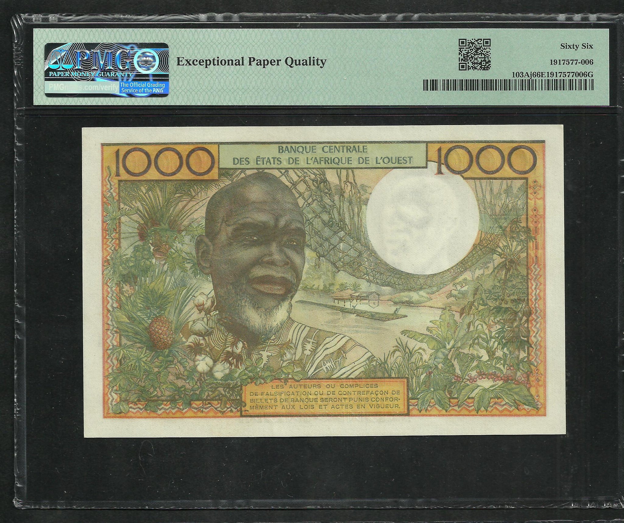 West Africa : Ivory Coast : 1000 Francs 1959 ; PMG : Gem UNC 66 (Ref 1912)